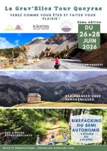 - Grav’Elles Tour Queyras bikepacking : NOUVEAU 3 jours (du vendredi au samedi) – 3 étapes : 1) 55 km D+ 2410 m / D- 1520 m 2) 60 km D+1110 m / D- 1490 m 3) 63 km D+ 1450 m / D- 1990 m